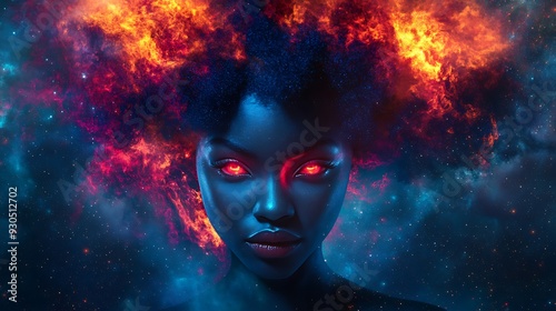 Cosmic Fury - Black Woman with Fiery Red Eyes Surrounded by Nebulae and Stardust in 3D Render