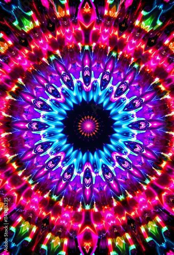 Cosmic kaleidoscope background. Abstract sci-fi mandala fractal luminous neon glowing colorful lights wallpaper, collage style, with white tones