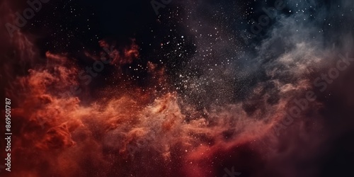 Cosmic Nebula with Red and Blue Hues, A dark sky filled with numerous small particles of red and white smoke