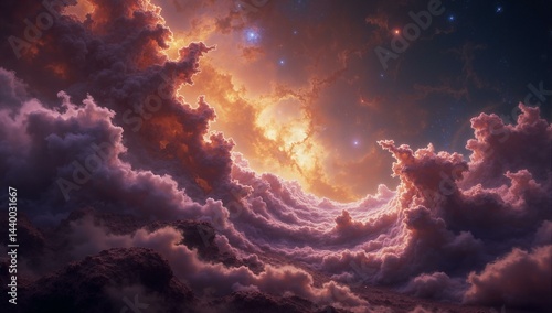 Cosmic nebula with swirling dust clouds, amber, rose gold, and lavender hues, resembling crystallized honey.