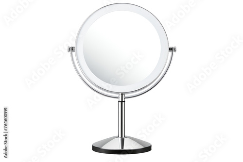Cosmic Reflections: Captivating Round Mirror on a Metal Stand. On White or PNG Transparent Background..