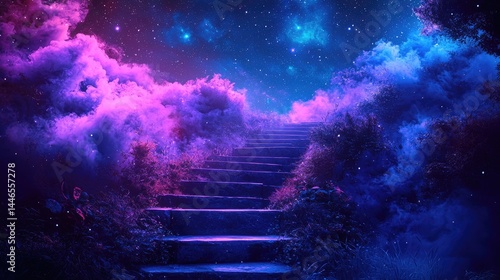 Cosmic stairway leading to a vibrant dreamlike sky.