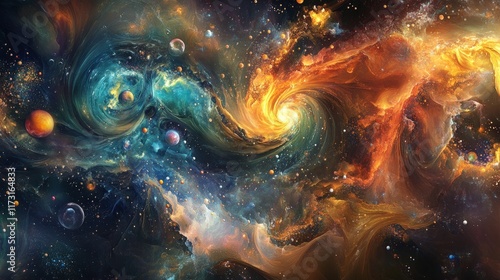Cosmic swirl of nebulae, planets, and stars in vibrant colors.
