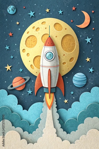 Cosmic Voyage: A paper-cut style illustration depicts a rocket soaring towards the moon. Capturing the wonder of space travel.