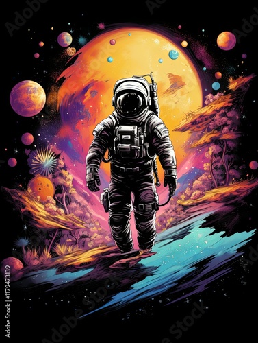 Cosmic Wanderer: Astronaut in Vibrant Surreal Landscape