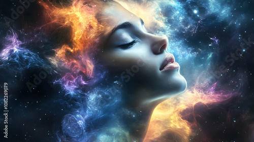 Cosmic Woman: A Serene Digital Art of a Woman's Face Embracing Celestial Nebulae, Vividly Colored and Dreamlike