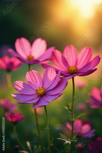 Cosmos flowers in full bloom, sunlight illuminating petals , petals, cosmos, sunset