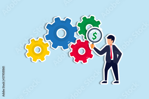 Cost effective, reduce cost and time to maximize better quality result, optimize cost and expense for better profit strategy concept, businessman with magnifier dollar money from cog gear production.