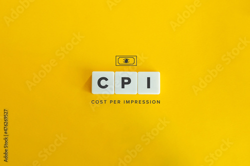 Cost Per Impression (CPI) Banner and Icon. Block letters on bright orange background. Minimal aesthetics.
