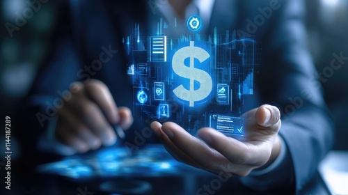 Cost saving concept, budget management and costs management. Economy recession economic cost savings. Businessman holding cost reduction icon on virtual screen