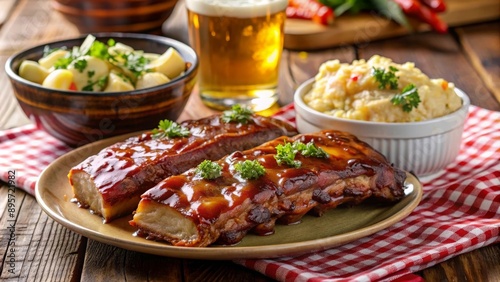 Costillas BBQ glaseadas servidas con puré de papas, ensalada y cerveza en una mesa de madera. Cocina estadounidense clásica y sabrosa.