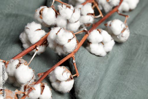Cotton plant with white flowers on grey-green cloth backdrop