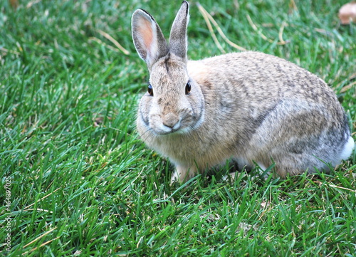 Cottontail rabbit on grass outdoors.