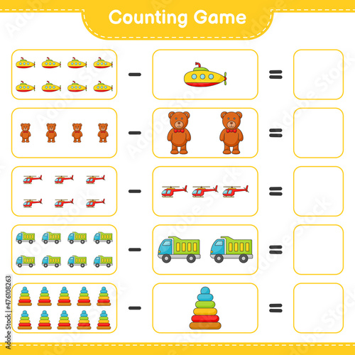 Count and match, count the number of Helicopter, Lorry, Pyramid Toy, Submarine, Teddy Bear and match with the right numbers. Educational children game, printable worksheet, vector illustration