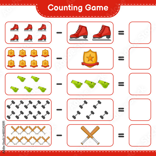 Count and match, count the number of Ice Skates, Whistle, Dumbbell, Baseball Bat, Trophy and match with the right numbers. Educational children game, printable worksheet, vector illustration