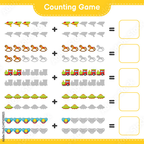 Count and match, count the number of Train, Ufo, Pacifier, Water Gun, Rocking Horse and match with the right numbers. Educational children game, printable worksheet, vector illustration