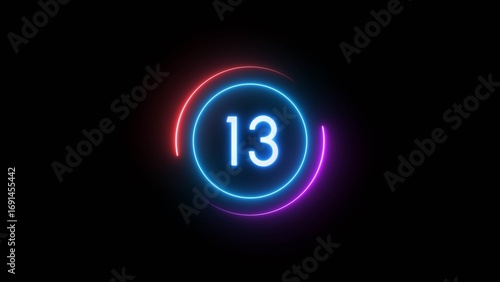 Countdown timer 13 seconds. Neon countdown number illustration.