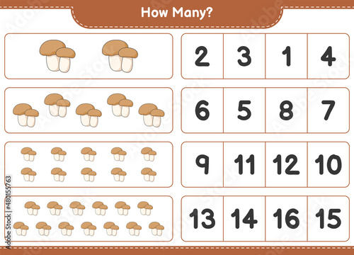 Counting game, how many Mushroom Boletus. Educational children game, printable worksheet, vector illustration