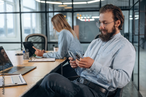Counting money. Man and woman are in the office together