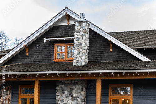 Country house in North America. Wooden house in green forest. wooden country house or cottage with wooden fence.