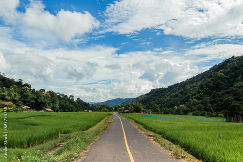 Country road or mountain middle road, Beautiful blue sky and cloud with green tree.