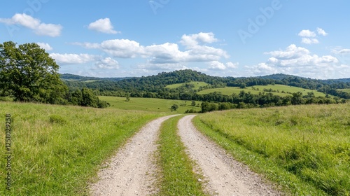 Country road through green hills under a partly cloudy sky. Possible use Stock photo for travel, nature, or outdoor advertising