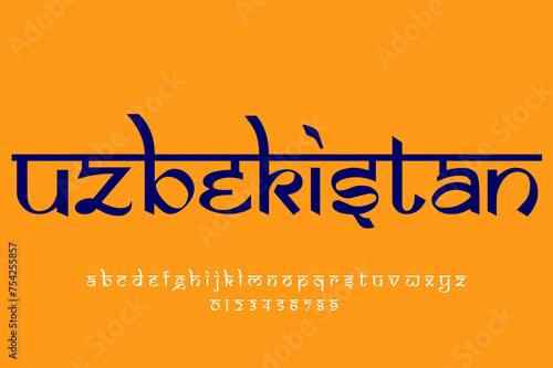 country Uzbekistan text design. Indian style Latin font design, Devanagari inspired alphabet, letters and numbers, illustration.