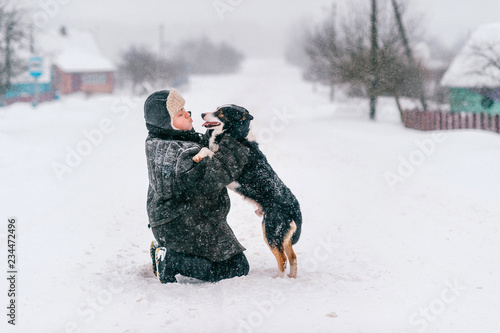 Country woman. Adult female walking the dog. Funny winter girl lifestyle outdoor portrait. Comic lady love her puppy. Owner playing with pet in snow. Loving couple. Domestic animal - human`s friend.