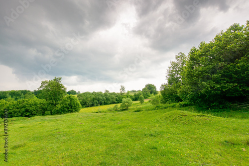 countryside landscape in mountains. beautiful scenery. cloudy weather. grassy meadow and forest on the hill in summer. vacation season