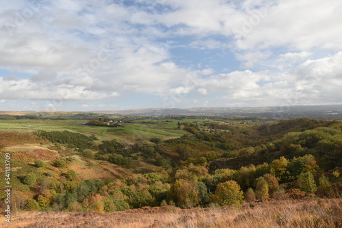 Countryside views from the top of a mountain with rural farmland and far reaching views. Taken in Bury Lancashire England.