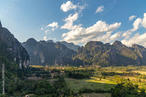 Countryside with farmland and karst mountains in the Vang Vieng. Vang Vieng, Vientiane Province, Laos