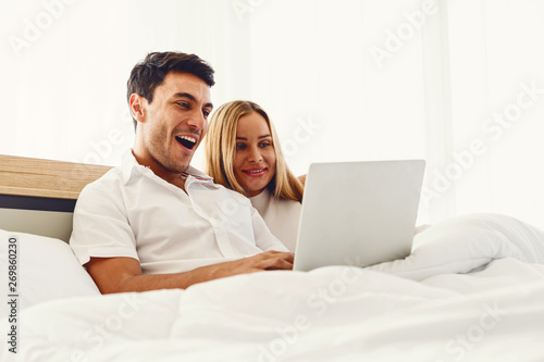Couple caucasian lover smiling showing very happy gesture while enjoy using laptop computer together on bed early morning