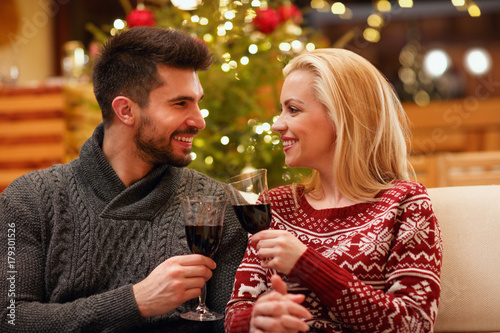 couple celebrating Christmas toasting with glasses of red wine.