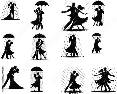 Couple Dancing in Rain Silhouette – Romantic Love Scene Vector Rain Dance Couple Silhouette – Love, Romance & Monsoon Mood