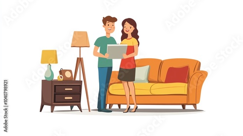 Couple discussing plans in a cozy living room with modern furniture.