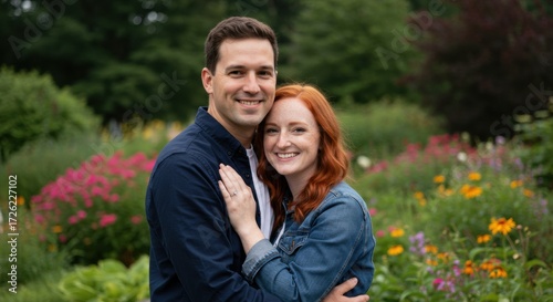 Couple embracing in vibrant flower garden outdoor portrait romantic atmosphere natural light