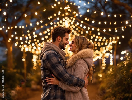 Couple embracing under fairy lights in cozy outdoor setting for Valentine's Day promotions, ideal for romantic evening advertisements and love-themed marketing