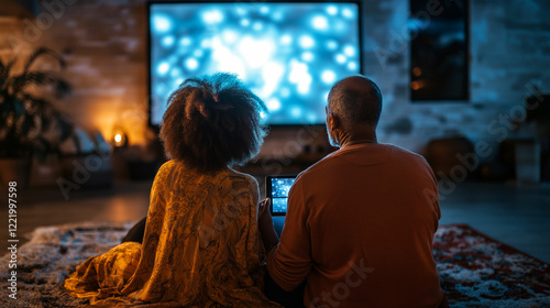 Couple enjoying a movie night together in a cozy living room with ambient lighting. Generative AI