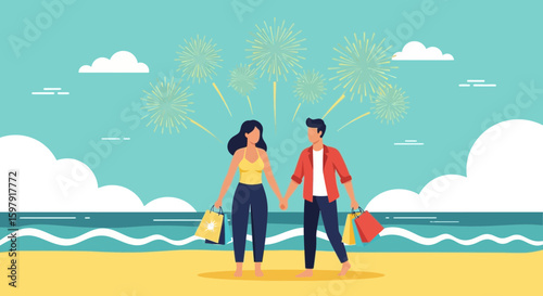 Couple Enjoying Beach After Shopping with Fireworks Display Celebration