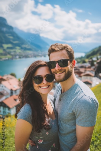 Couple enjoying outdoor summer vacation with sunglasses smiling together near scenic lake and mountains, happy relationship bonding travel adventure.