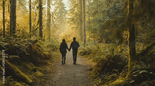 Couple enjoys a peaceful walk hand in hand along a forest path surrounded by nature during golden hour