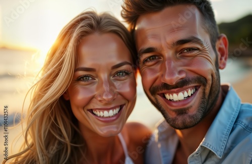 Couple enjoys romantic outdoor date. They take selfie on beach at sunset. Happy and relaxed. Perfect moment shared. Beach vacation mood. Couple smile happily. Perfect for couples or vacation photos.