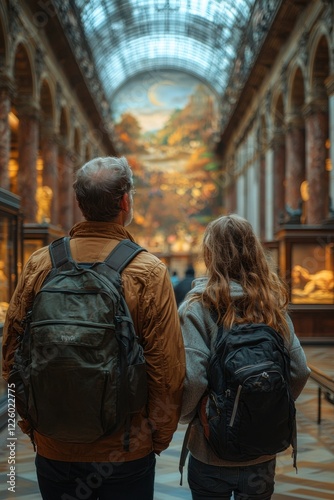 Couple explores a historic museum while admiring art and artifacts in a grand gallery setting