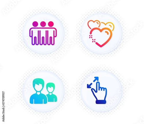 Couple, Heart and Friendship icons simple set. Button with halftone dots. Touchscreen gesture sign. Two male users, Love, Trust friends. Zoom in. People set. Gradient flat couple icon. Vector