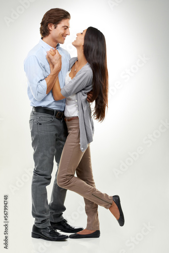 Couple, holding hands and hug for valentines day in relationship embrace isolated against a gray studio background. Happy man and woman hugging and enjoying intimate romance for special month of love