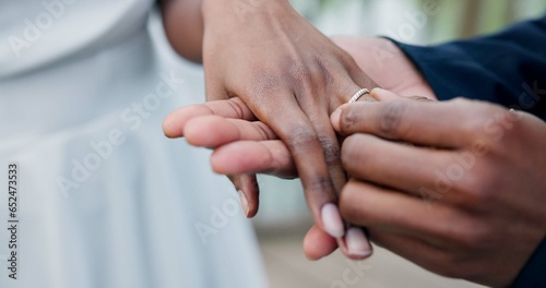 Couple, holding hands and ring for marriage, love or wedding in ceremony, commitment or support. Closeup of people getting married, vows or accessory for symbol of bond, relationship or partnership