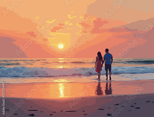 Couple holding hands and walking along the beach at sunset, with dramatic clouds and a warm glow over the ocean