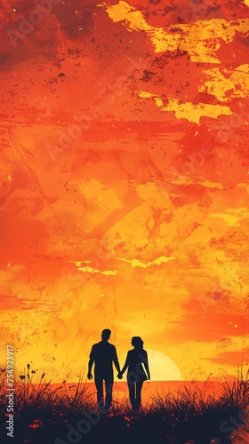 Couple holding hands at sunset silhouettes against a vivid orange sky in a minimalist illustration style