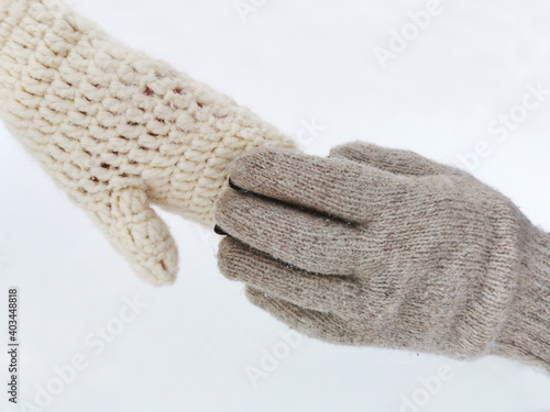 Couple holding hands in gloves in winter season on the background of white snow