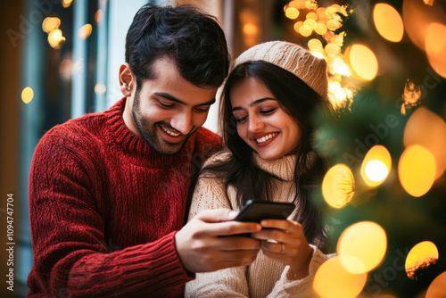 couple holding smartphone on Christmas festival